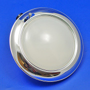 Round interior lamp with switch, chrome rim with domed opaque glass lens held with spring wire clip, dimensions 120mm diameter x 20mm tall, lamp base protrudes 20mm on the back of the lamp with...