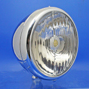 Freestanding chrome plated headlamp unit fitted with 12 volt light unit providing main beam, dipped beam and sidelight). These lamps measure approx 182mm diameter x 140mm deep overall. Single 12mm...