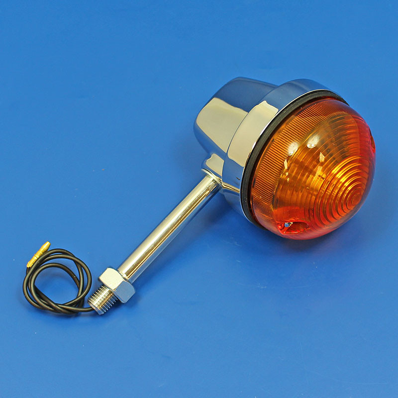 Small, best selling lamp of modern manufacture particularly suitable for flashing indicator use. Chrome plated body with amber lens. Body approximately 58mm diameter x 70mm long. Single mounting stud, with M8 x 1.25 pitch thread. Uses an SCC BA15S bulb. For bulbs, please see our B244 (6v) or B245 (12v).