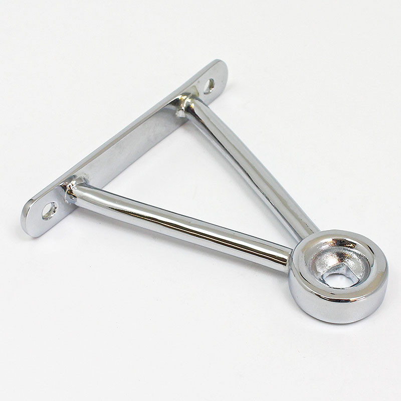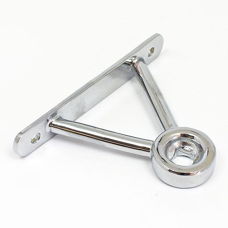 Triangular mirror mounting bracket, similar to the Lucas style mount used on some MG's. Flat base plate 140mm x 19mm with hole centres 119mm apart. Two 9mm diameter rods connect the plate to the mirror head boss, overall bracket height 90mm. Lost wax cast in bronze, available in chrome plated finish only.