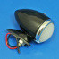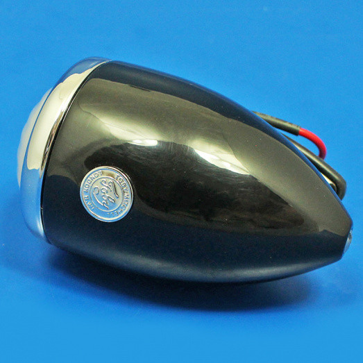 Vintage 'Toby' side lamp equivalent to Lucas part number 1142. Originally fitted to many quality cars including Rolls-Royce and Bentley. All brass construction with gloss BLACK powder coated finish to lamp body and plinth, with a CHROME rim. Converted bulb holder arrangement to provide indicator and side lamp functionality (as our 424A bulb holder conversion for the 1130). Takes WEDGE T10 base capless bulbs - part numbers B501 and B921A (12V only), supplied. Upgrade to LED functionality with lamp kit 424ALEDBK and and electronic flasher unit LEDFLASH3. Rim and lens arrangement as original lamp.