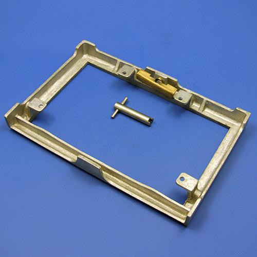 Aluminium petrol can frame which screws to running board and totally surrounds the base of the can. smooth aluminium frame 294mm x 190mm into which can sits, to be retained with an internal clamp, actual inner aperture measures 255mm x 159mm, supplied with slotted key. suitable for old original cans which measure approx 10" x 6" base.