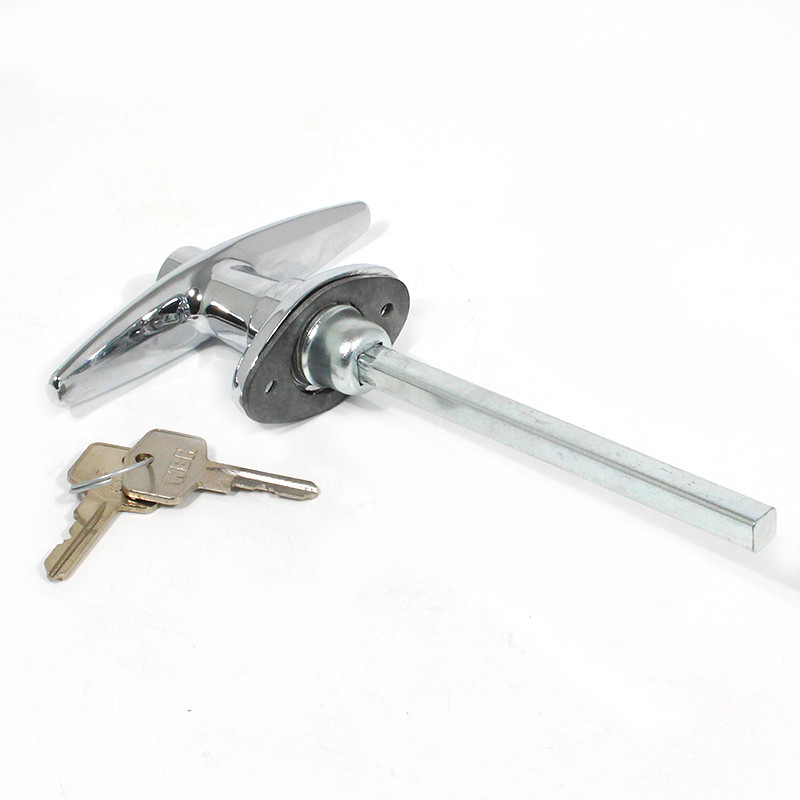 Plain T boot handle approx 108mm, escutcheon hole centres 36mm, chrome plated. Available locking only.