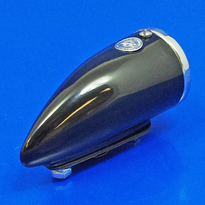Streamline 'Torpedo' style side/wing lamp. A quality reproduction of the Lucas 1130 type side lamp, originally available with ebony black body and plated rim. Gloss black powder coated brass body approximately 100mm long x 46mm diameter. Frosted glass lens with chrome rim retained by screw in top. Mounted by two bolts in base. Rubber mounting pad supplied.