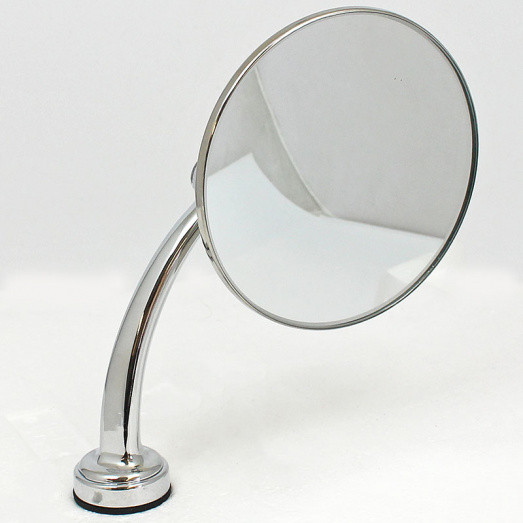 Round shape mirror head. 107mm diameter stainless steel mirror head offered with either CONVEX or FLAT glass. Offered with a choice of four designs of chrome stem - please make your selection below, along with flat or convex glass. All four arms mount through a 16mm hole in the panel and protrude 50mm under.