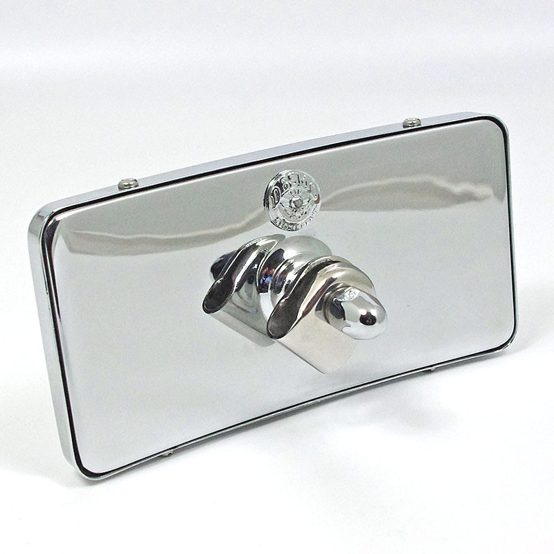 Brass rectangular CONVEX glass mirror. Case 6 1/4" x 3 1/4" (155mm x 80mm) with central rear mounting clamp. Cast bronze Desmo medallion (finished as the mirror body) riveted to the back of the mirror case. Reproduction of a popular style of period mirror produced by Raydyot and Desmo (the very popular Type 36). All brass construction, available in chromium or nickel plated finish, Polished stainless screws to outside of rim.