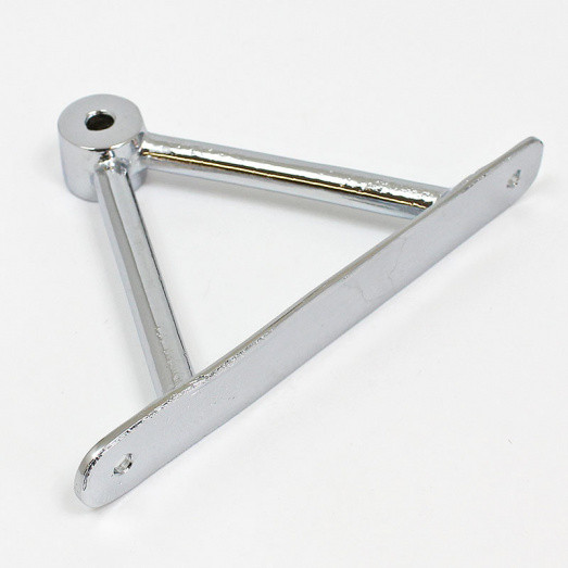 Triangular mirror mounting bracket, similar to the Lucas style mount used on some MG's. Flat base plate 140mm x 19mm with hole centres 119mm apart. Two 9mm diameter rods connect the plate to the mirror head boss, overall bracket height 90mm. Lost wax cast in bronze, available in chrome plated finish only.
