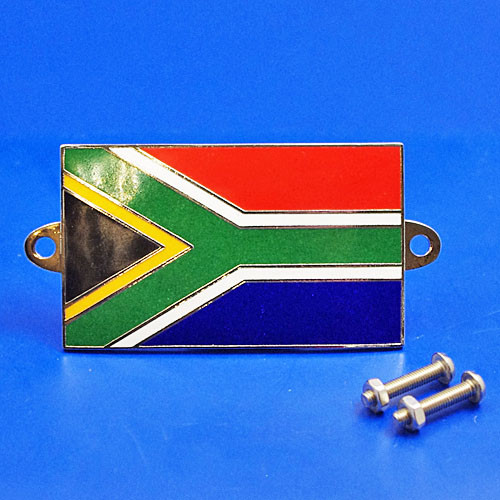 Patriotic national flag badge of South Africa, hard jewellers enamel badges, multi coloured, chrome backing approx 56mm x 35mm, supplied with two mounting bolts for mounting on to bonnet or grill