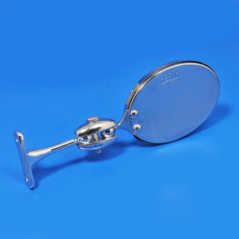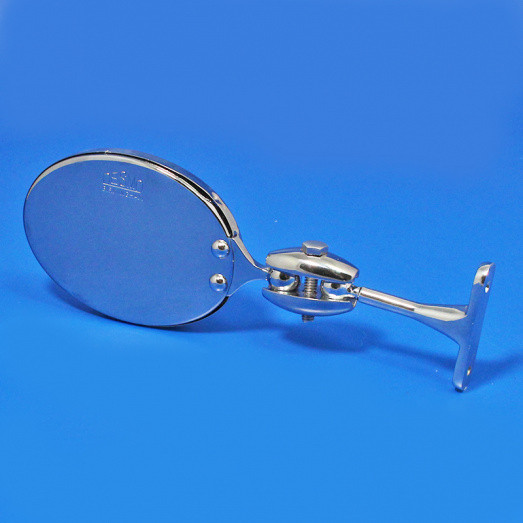 Oval mirror equivalent to the Desmo 263 model. Back of mirror casing embossed Desmo. Convex mirror glass. Suitable for vehicles of the '30's. Head size 110mm x 82mm, overall length 218mm. Complete with extended flat base mounting bracket 70mm long, base 57mm x 14mm, hole centres 38mm approx. Our own manufacture, brass/bronze construction, recreated from an original 'Desmo' mirror pattern, chromium plated finish only. Although these were originally made for right hand mounting, we do offer left hand mounting if specified in the option box.