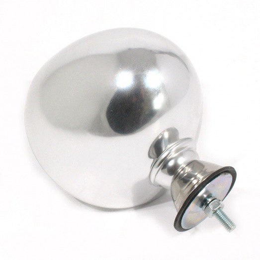 Round lightweight alloy racing mirror. 4" (100mm) diameter, 90mm deep, single stud (6mm diameter x 20mm long) fixing at base. FLAT glass.