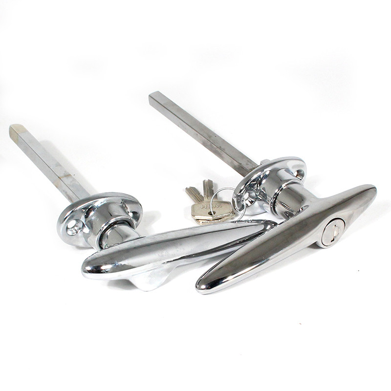 Torpedo shaped outside handle approx 120mm long, fitted with mounting escutcheon with hole centres approx 34mm. Chromium plate finish. Please note that these handles are handed.
