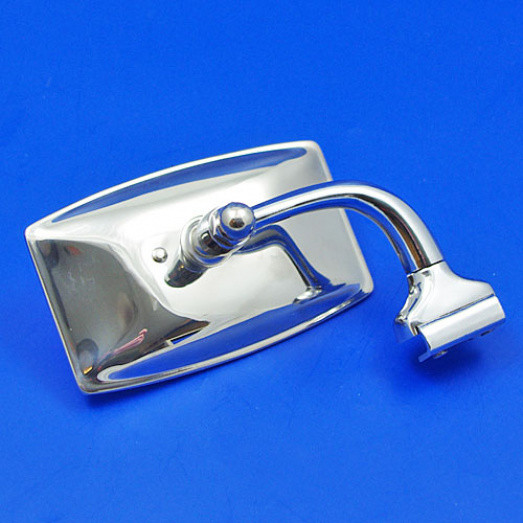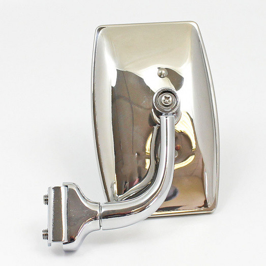 Quarterlight clamp on stainless steel mirror. FLAT glass 115mm x 70mm with stainless steel back mounted on a curved arm. Arm extends out 55mm from mounting screws and then 65mm up to the centre of the mirror head. Two grub screws nip the assembly to the edge of the opening quarterlight. Universal mirror that will fit on either the left or right hand side of the vehicle.