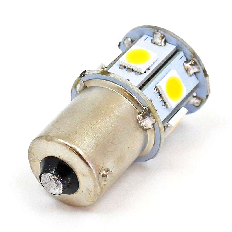 9 x 5050 SMD LED BA15S 6 Volt multi-directional warm white lamp. LED upgrade and direct replacement for B244. LED equivalent to c10W bulbs. In testing, brighter than 6V incandescent bulb B244B. Compatible with either negative or positive earth systems. Very low current draw - over 75% less than incandescent and halogen bulbs so great for low powered electrical systems. 3000K warm, white colour temperature. Applications include sidelights and repeaters, dash lights and number plate lights. 37mm total bulb length, 20mm head diameter, no cover.