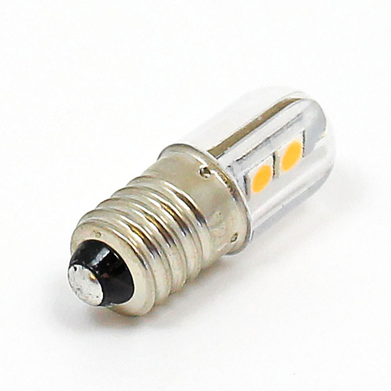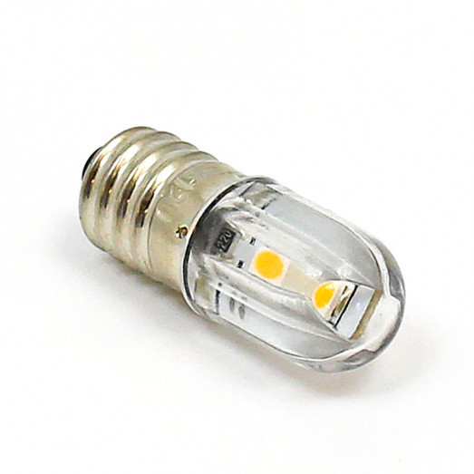 4 x 3030 SMD LED MES E10 12 Volt multi-directional bright white lamp. LED upgrade and replacement for B987B type bulbs. MES E10 base. T10 tubular glass cover. Compatible with either negative or positive earth systems. Very low current draw - over 75% less than incandescent and halogen bulbs so great for low powered electrical systems. 3000K warm, white colour temperature. 29mm total length.
