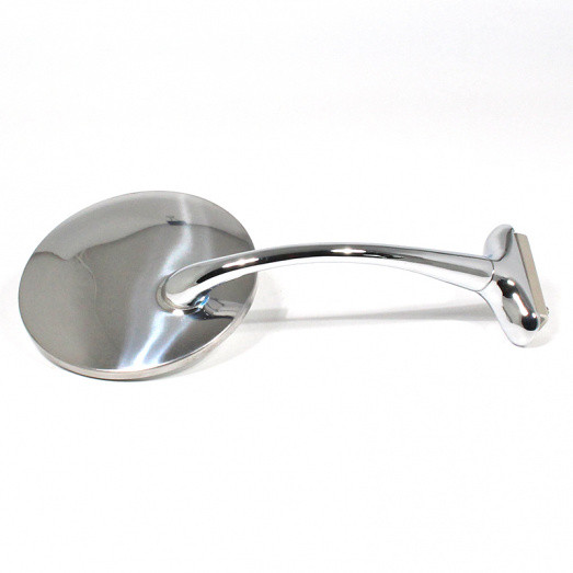 Round mirror with long, curved mounting arm. 4" circular polished stainless steel mirror head with 140mm long curved chrome arm. Adjustable mounting bracket. For mounting on the left or right hand side of the vehicle.