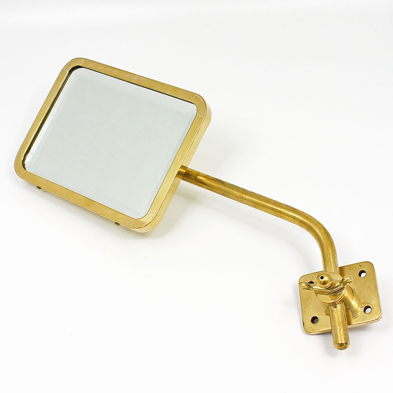 Heavy veteran or Edwardian pattern mirror of a style traditionally manufactured by Toby. Flat mirror glass with bevel edge and heavy rim and backing. Head dimensions 172mm x 135mm. Substantial arm approx 270mm long with very secure mounting base plate 50mm x 63mm. This item is offered in polished brass or with nickel plated finish at additional cost and by special order. The mirror head is hand made in our workshops, the base components lost wax cast with the whole assembly finished by ourselves.