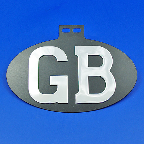 Black stove enamelled oval plate (190mm x 105mm) with chrome on brass GB letters (84mm tall) fixed with brass nuts, with two oval slots 12mm x 5mm for mounting,