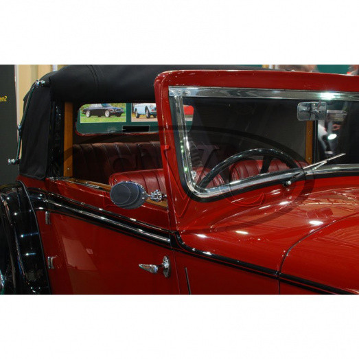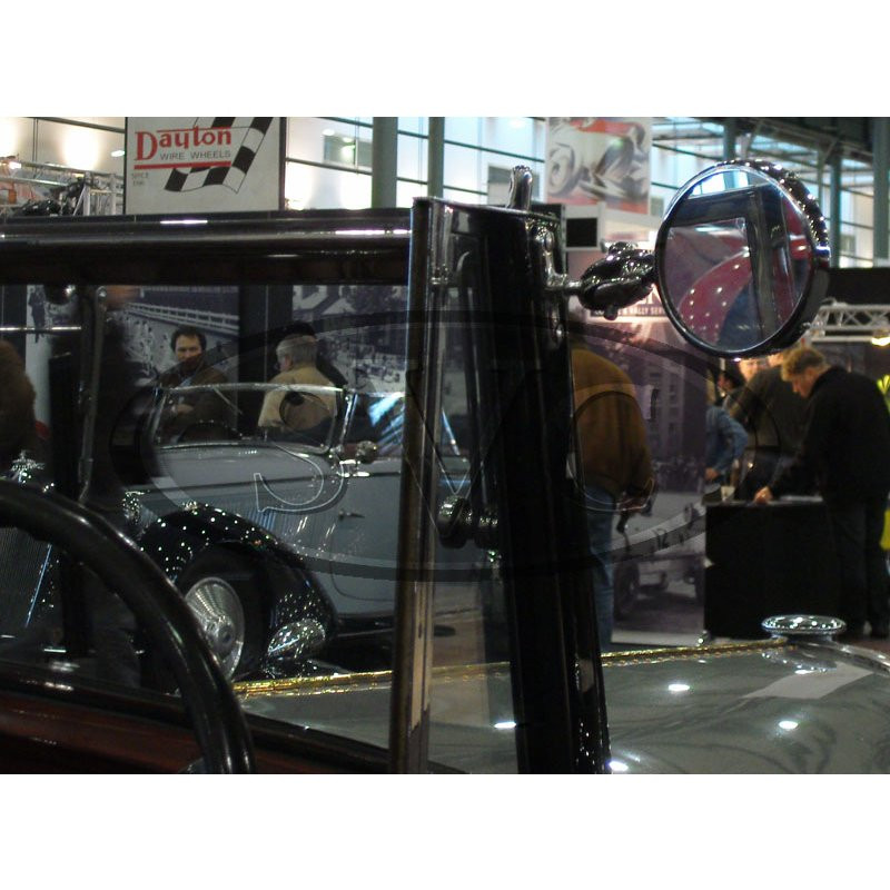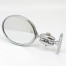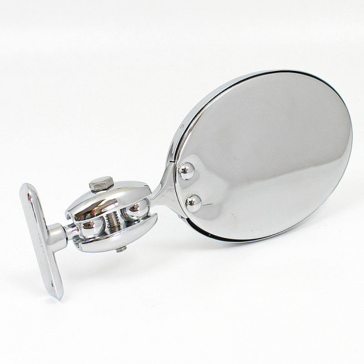 Oval mirror with jointed arm. Fine reproduction of this very popular mirror. Head size 110mm x 82mm, fitted with a CONVEX glass for ease of overtaking, concave base on two hole fixing bracket, width of hole centres 43mm. Overall width 175mm. All brass head and bracket assembly. Offered in polished brass, nickel or chrome plated finish. Very similar in style to the Raydyot M39 model. Please note, unlike our 653 mirror, this mirror is NOT embossed on the back of the mirror head.
