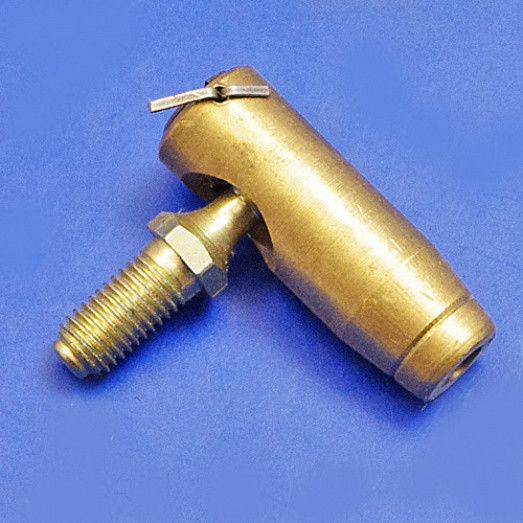 Brass body adjustable ball joint. Non detachable, 10/32" UNF thread into body x 1/4" UNF thread on pin. Has a cross pin to retain a screw adjuster in the end.