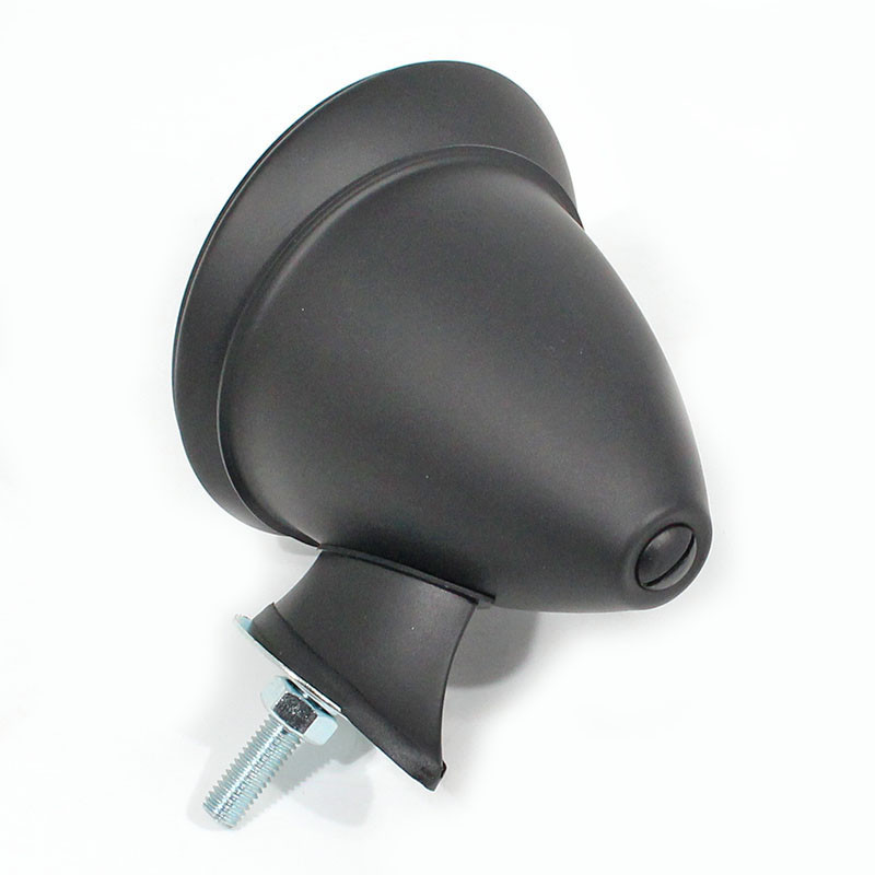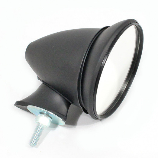 Small bullet/racing mirror with single bolt fixing. All black finish. 4" 100mm diameter overall approximately. FLAT glass lens approx. 3 1/2" (90mm) diameter. M6 mounting stud supplied complete with nut and washer. Adjustable mirror head.