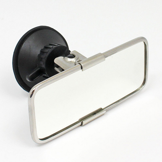 Polished stainless steel suction interior rear view mirror. Mirror head size 128mm x 56mm, with stainless steel backing and edge rim. 62mm diameter suction pad held by traditional mirror clamp bracket. Overall depth from suction pad to mirror face 70mm.