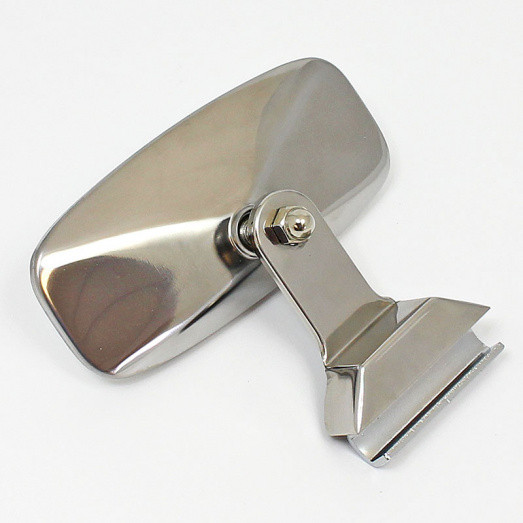Quarterlight glass type clamp on stainless steel mirror. FLAT glass 118mm x 55mm, with stainless steel mirror back and straight bracket. Two screws nip the assembly to the edge of the opening quarterlight, maximum thickness 6mm. To suit either the right hand or left hand side of the vehicle. Supplied with mounting pads, allen screws and allen key.