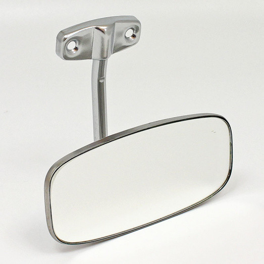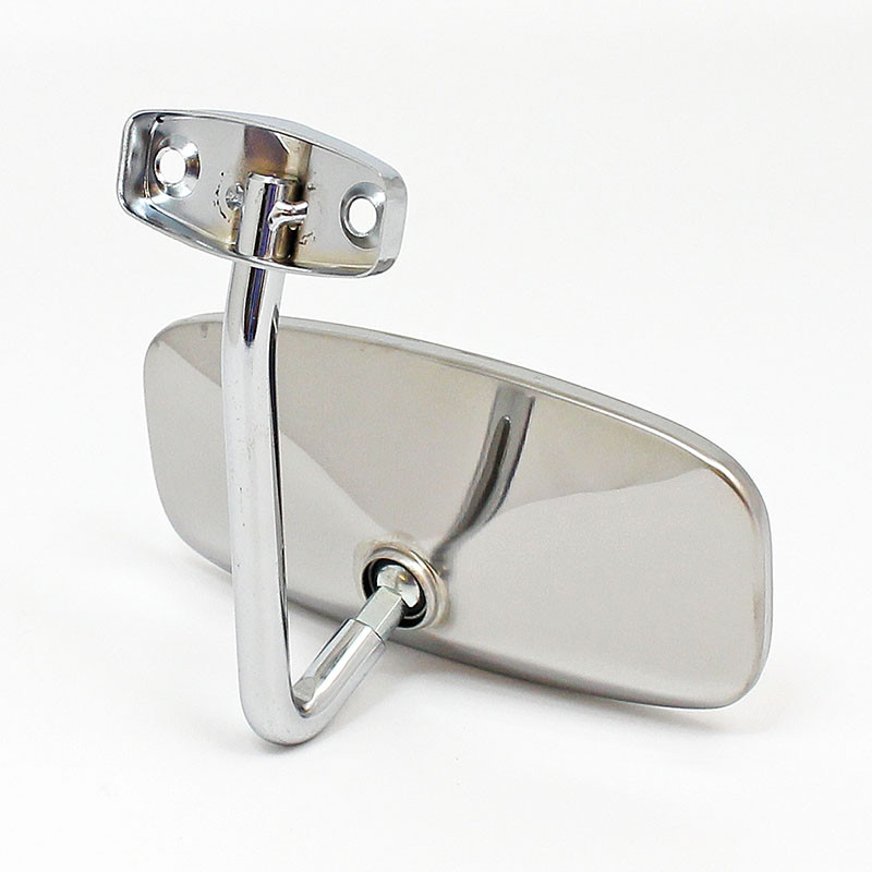 Polished stainless steel flat glass interior mirror with chrome finish swan neck arm. Mirror head measures 118mm x 54mm, mounting arm is 80mm tall with mounting bracket 50mm x 20mm, holes centres at 36mm.