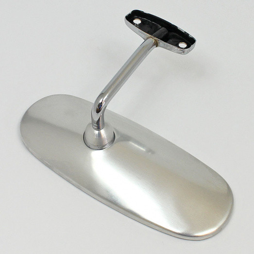 Satin finish stainless steel FLAT glass interior mirror with a chrome offset arm, as originally used on the VW T2. Mirror head measures 155mm x 60mm, mounting arm is 85mm tall with mounting bracket 50mm x 20mm, holes centres at 36mm. The arm offset is to the right of the mirror head, distance from each edge to centre of arm - long 95mm, short 60mm.
