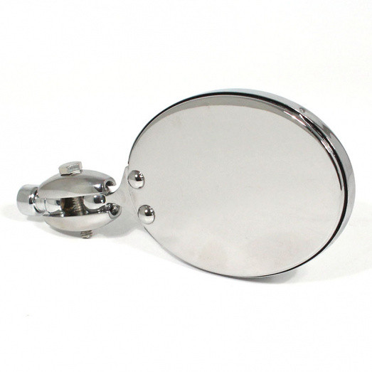 Superb reproduction of the very popular 'Raydyot' oval mirror with single hole fixing. Chrome on brass finish. Mirror head approx 110 by 82mm. Fitted with our unique single hole fitting stud for improved mounting point flexibility. Flat or convex glass available, please indicate preference. Please note this mirror is NOT embossed on the back of the mirror head.