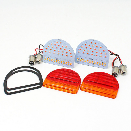 These boards have a very low power requirement and provide great all over lens lighting from 27 RED LEDs and 24 AMBER LEDs, with the fast response time/illumination under braking characteristic of LEDs - plus good distinction between STOP and TAIL brightnesses. This is a 'plug and play' product that requires no attachment other than plugging in the two bulb connectors and locating the LED board between the lens and the lens retaining spring clip, then reassembly of the lamps with the new Red/Amber lenses instead of the all Red split lens. Two 1.5mm thick rubber lens seals are provided in the kit, one for each lens if required. Conversion kit for a PAIR of lamps.