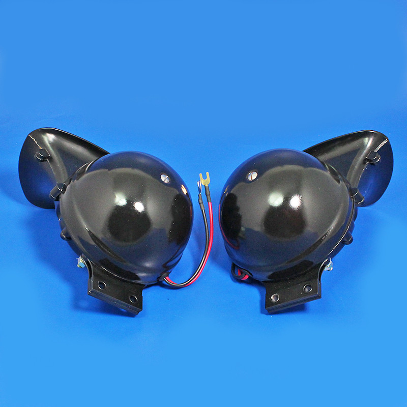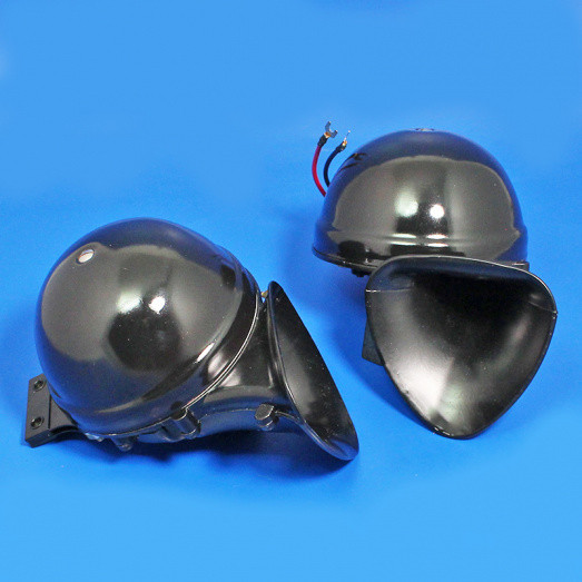 Pair of black Windtone horns giving high and low notes. This type of horn set was fitted to many British cars of the 1940s and 1950s, and provides a robust but musical ''hoot''. A quality reproduction of the original Lucas WT618, under bonnet model of the wind tone horn. Compact, lightweight with a black finish.